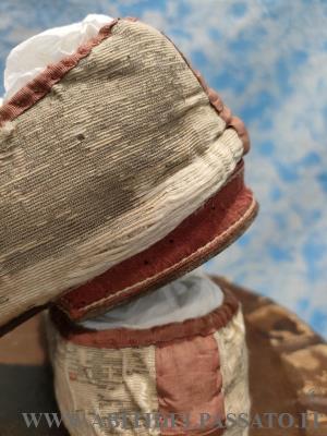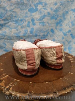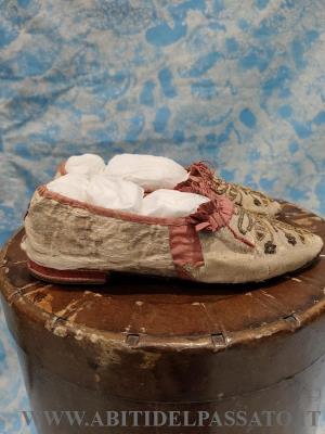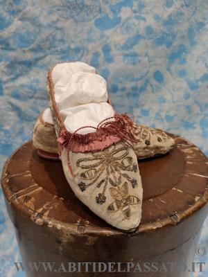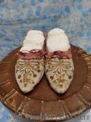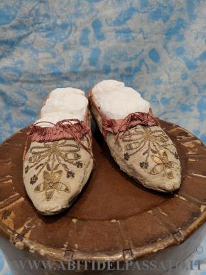 1760-70 CIRCA, MANIFATTURA ITALIANA PER QUESTE SCARPETTE FEMMINILI, REALIZZATE IN TESSUTO DI SETA E FILATO METALLICO. RICAMATE DA PAILLETTES METALLICHE, CANUTIGLIA, FILO METALLICO, CORDONCINO E NASTRI IN SETA.