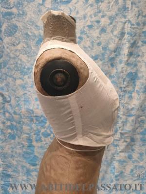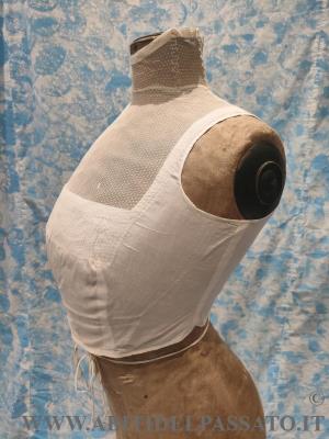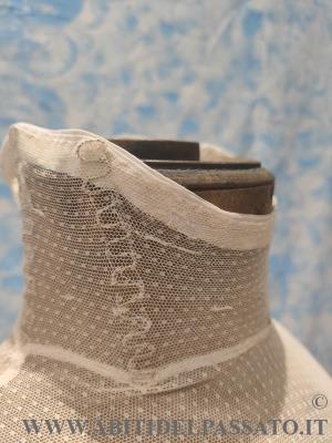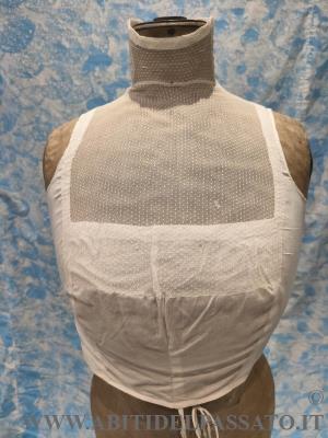 1903-1905: MANIFATTURA ITLIANA, FINTA CAMICIA SOTTO GIACCA, REALIZZATA IN TELA DI COTONE E TULLE PLUMETIS. CHIUSA POSTERIORMENTE MEDIANTE GANCI, GUIMPE SOSTENUTA DA QUATTRO SERPENTINE METALLICHE.