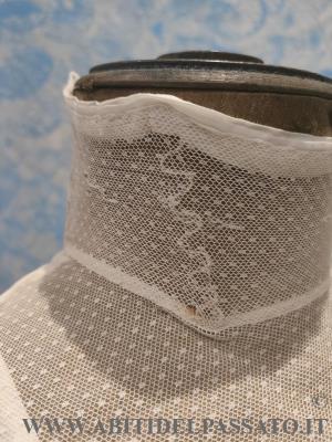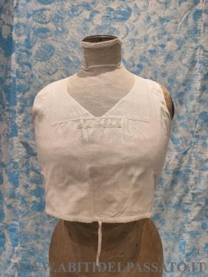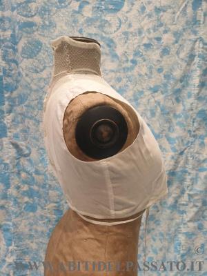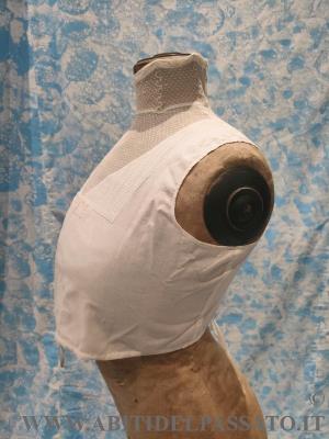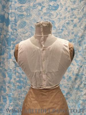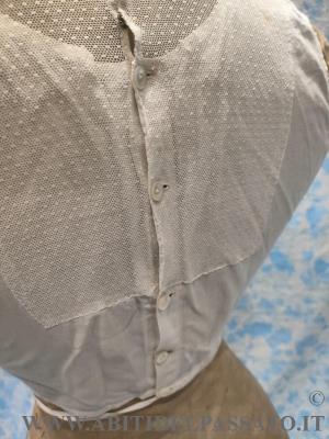 1903-1905: MANIFATTURA ITALIANA, FINTA CAMICIA SOTTO GIACCA, REALIZZATA IN TELA DI COTONE E TULLE PLUMETIS. CHIUSA POSTERIORMENTE MEDIANTE BOTTONI E AUTOMATICI, GUIMPE SOSTENUTA DA QUATTRO SERPENTINE METALLICHE.