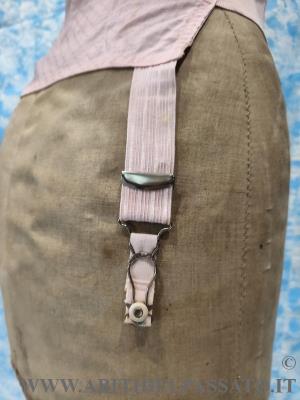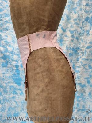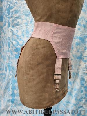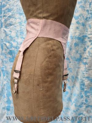 1915-1920, MANIFATTURA IGNOTA,PROVENIENZA FRANCESE, PER QUESTO REGGICALZE REALIZZATO IN TESSUTO OPERATO DA CORSETTERIA, DI COLORE ROSA ANTICO. CHIUSURA LATERALE MEDIANTE 4 GANCI.