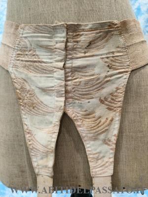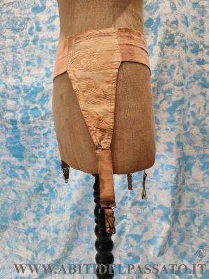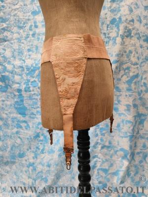 1900-1910, MANIFATTURA IGNOTA, PROVENIENZA FRANCIA, PER QUESTO REGGICALZE REALIZZATO IN SETA OPERATA IN COLOR SALMONE, APERTO FRONTALMENTE MEDIANTE 5 GANCI. CONDIZIONI OTTIME.