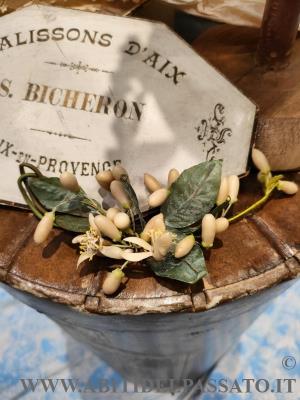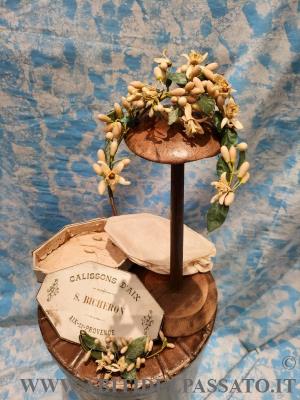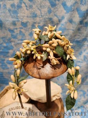 ACCONCIATURA DA SPOSA REALIZZATA A CORONCINA, IN FIORI D'ARANCIO DI CERA E RAMETTO A PARTE (solitamente veniva appuntato nel corpino o nella gonna).