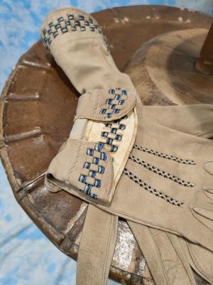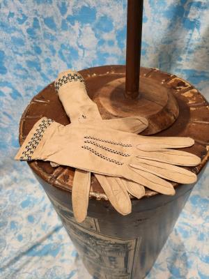 1910-15: MANIFATTURA ITALIANA, GUANTI DA GIORNO REALIZZATI IN CAPRETTO DI COLORE BEIGE. RICAMATI SUL DORSO IN FILATO DI SETA, DA DOPPIO GIRO DI PUNTO CATENELLA E DECORATI CON LAVORAZIONE AD INTAGLIO DA PASSAMENERIA