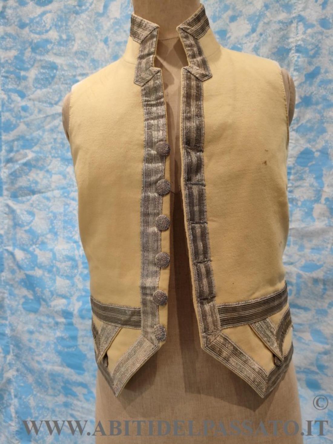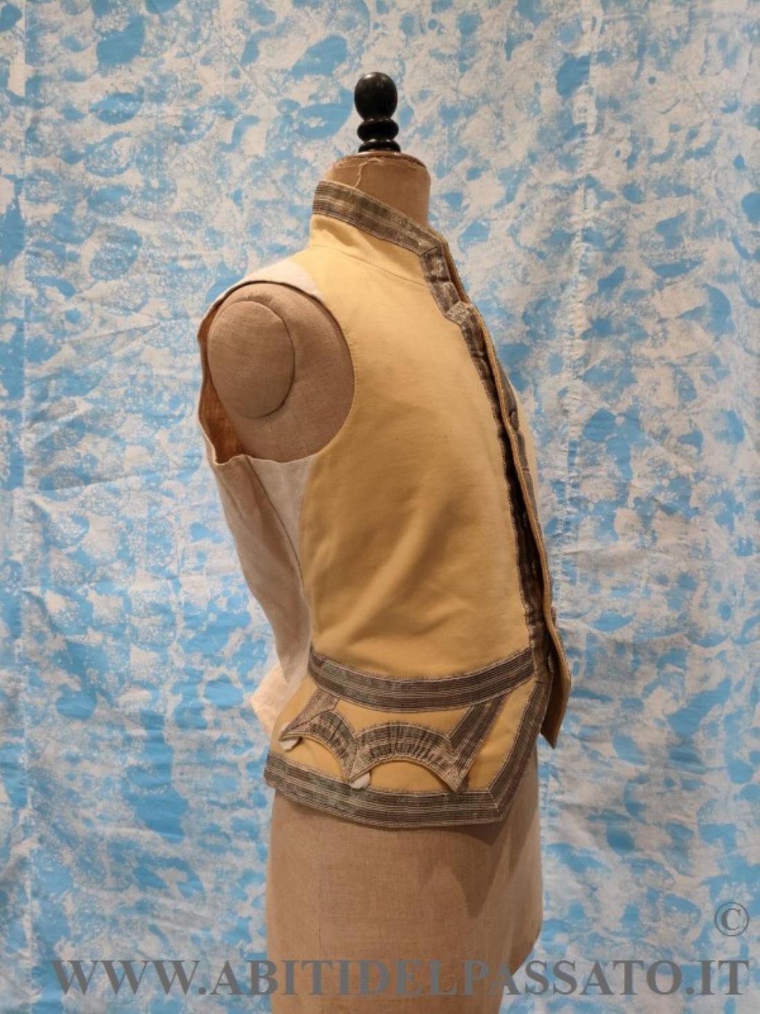 GILET DA SERVIZIO, REALIZZATO IN PANNO DI LANA COLOR BURRO, GALLONI METALLICCI, BOTTONI RICAMATI, FODERA GREZZA DI LINO.
