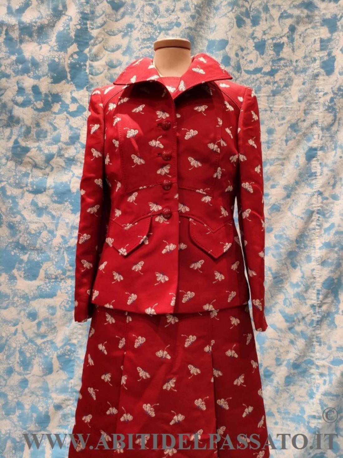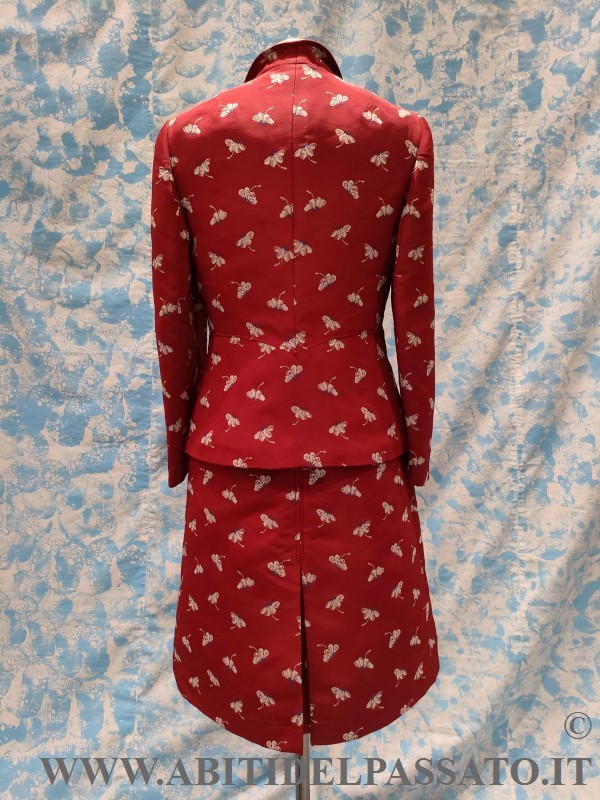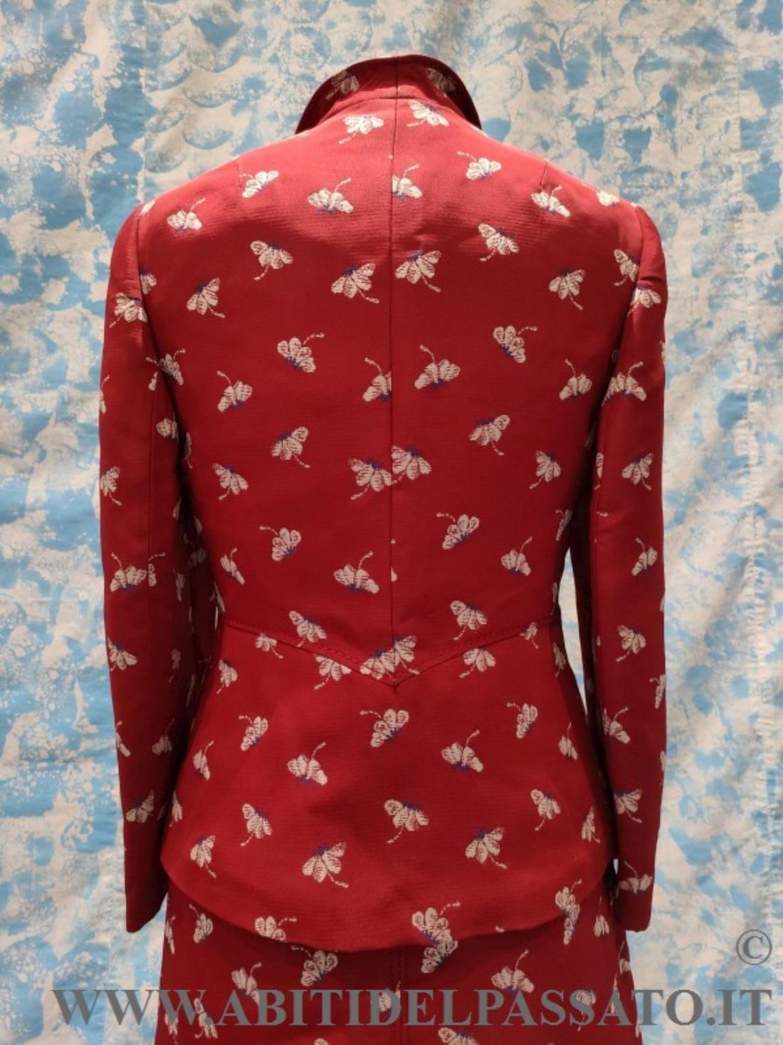 COMPLETO REALIZZATO IN TESSUTO MATELASSE' MISTO SETA, LA BASE DI COLORE ROSSO VIVO, CON MOTIVI FLOREALI NEI TONI DELL'AZZURRO E AVORIO, COMPOSTO DA ABITO INTERO SENZA MANICHE E GIACCA A MANICA LUNGA, IN DOTAZIONE ANCHE COPPIA DI MANICHE CORTE.
