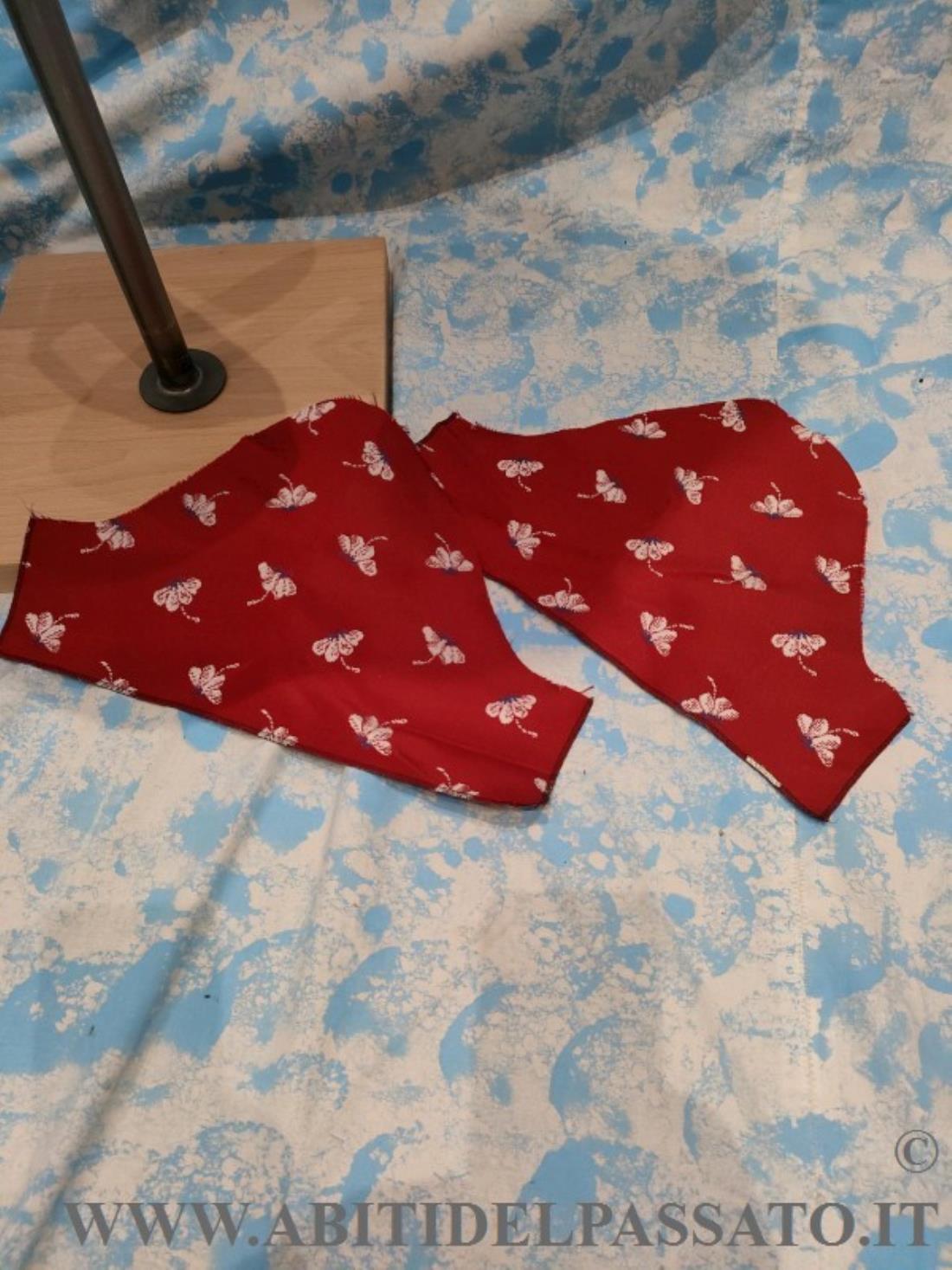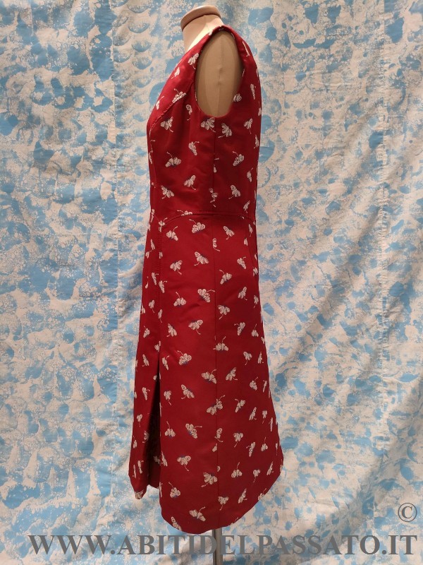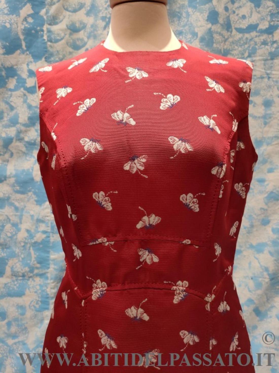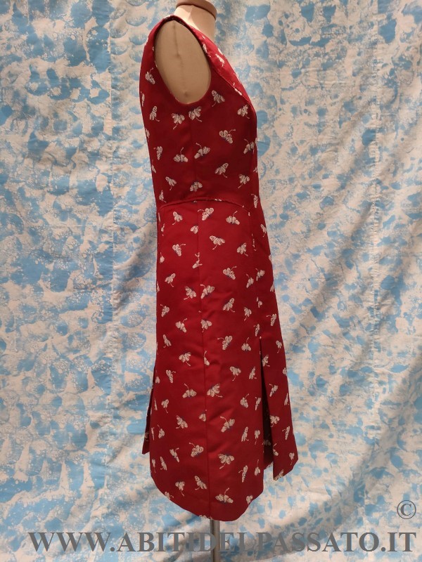 COMPLETO REALIZZATO IN TESSUTO MATELASSE' MISTO SETA, LA BASE DI COLORE ROSSO VIVO, CON MOTIVI FLOREALI NEI TONI DELL'AZZURRO E AVORIO, COMPOSTO DA ABITO INTERO SENZA MANICHE E GIACCA A MANICA LUNGA, IN DOTAZIONE ANCHE COPPIA DI MANICHE CORTE.