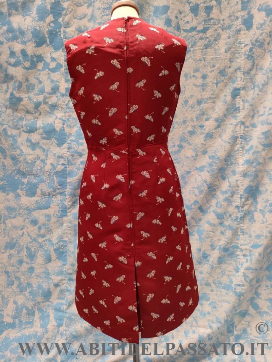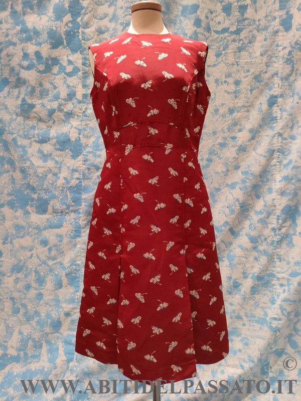 ABITO AL GINOCCHIO, CHIUSO POSTERIORMENTE DA ZIP, TAGLIATO IN VITA, GONNA SVASATA ARRICCHITA DA PROFONDI FALDONI.