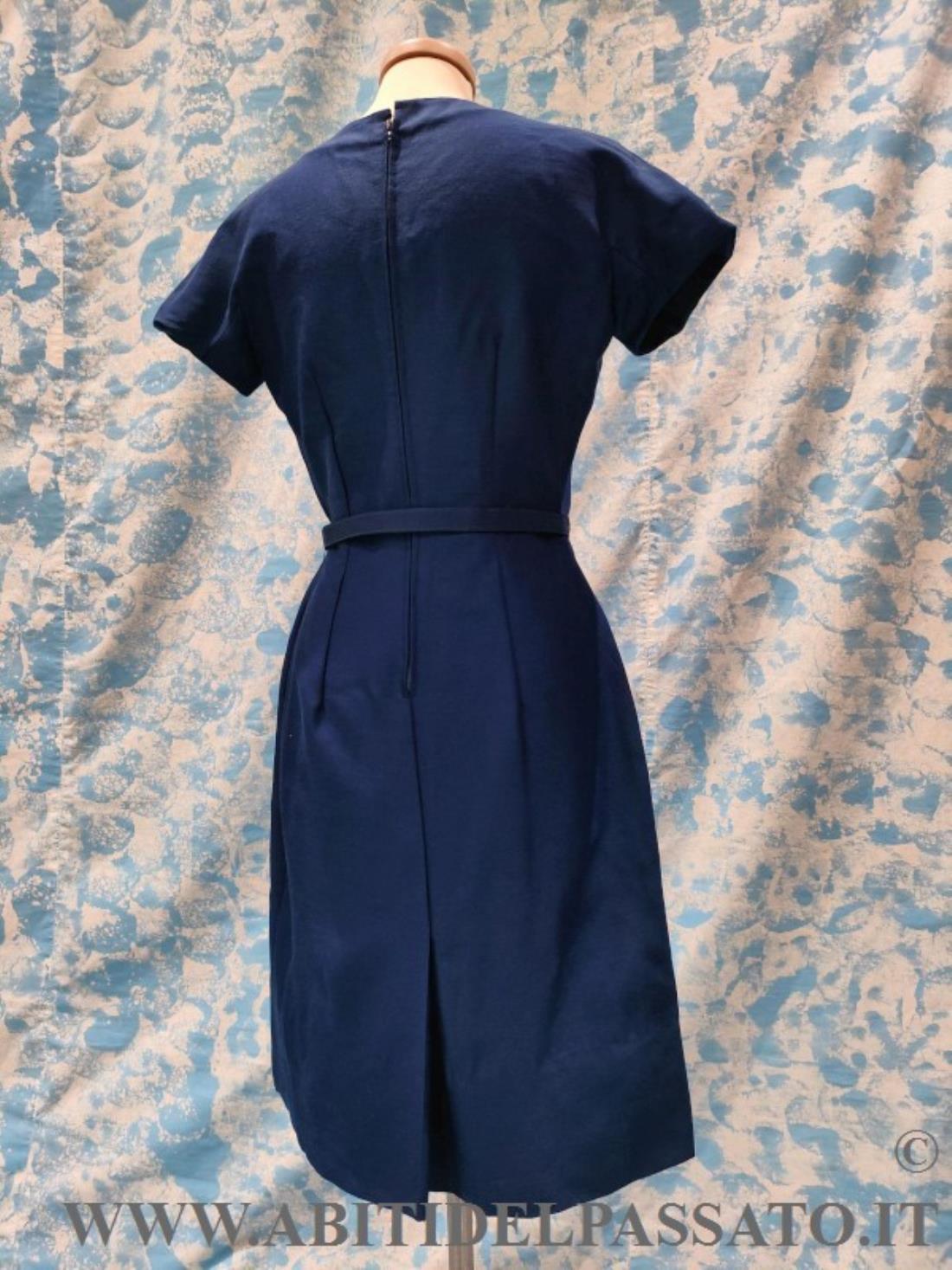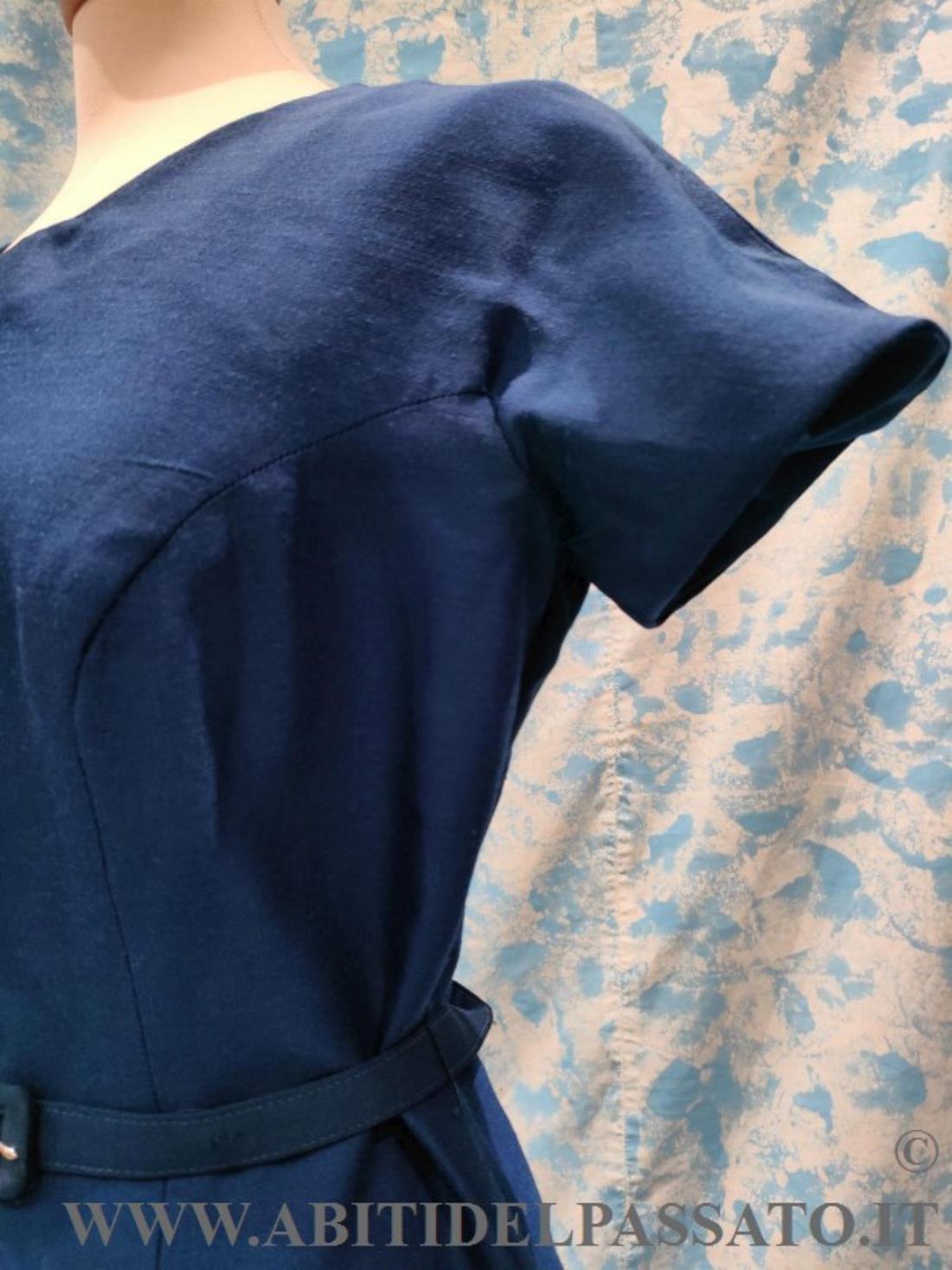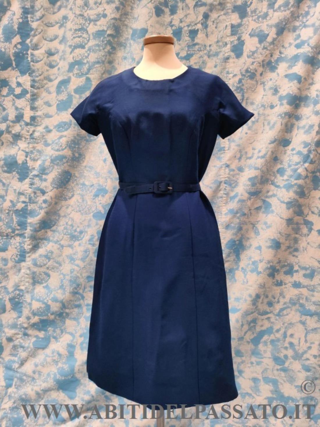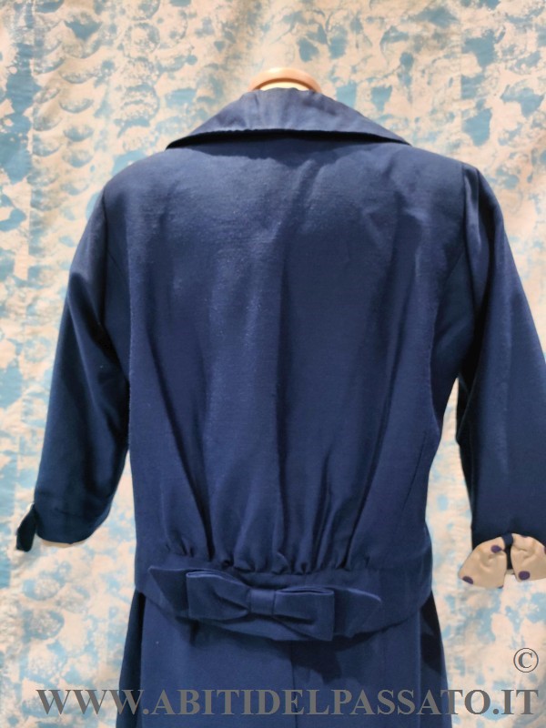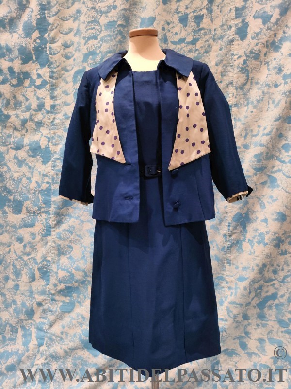 COMPLETO DA CERIMONIA, REALIZZATO IN TESSUTO DI LANA E SETA DI COLORE BLU CERULEO, COMPOSTO DA ABITO INTERO, CINTURA, GIACCA E SCIARPA.