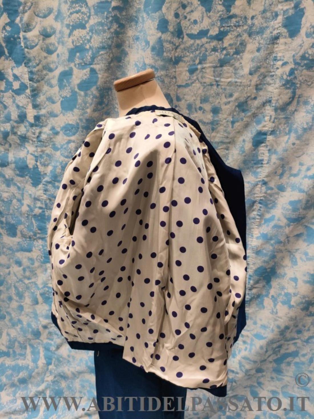GIACCA CON MANICA A TRE QUARTI,CHIUSA FRONTALMENTE MEDIANTE BOTTONI, MOLTO PARTICOLARE LA SCHIENA, CON TAGLI VERTICALI, CON ARRICCIO AL FONDO NEL TAGLIO CENTRALE. UN GRANDE FIOCCO POSTO SUL FONDO COMPLETA L'INSIEME.
