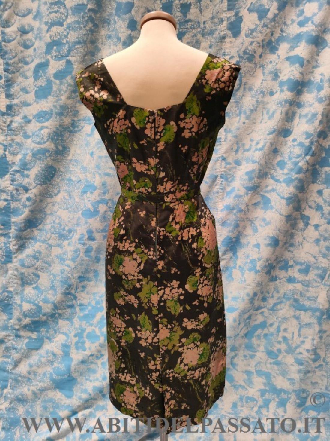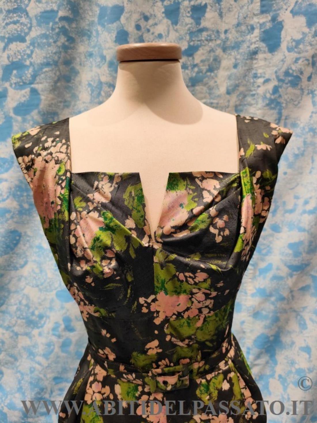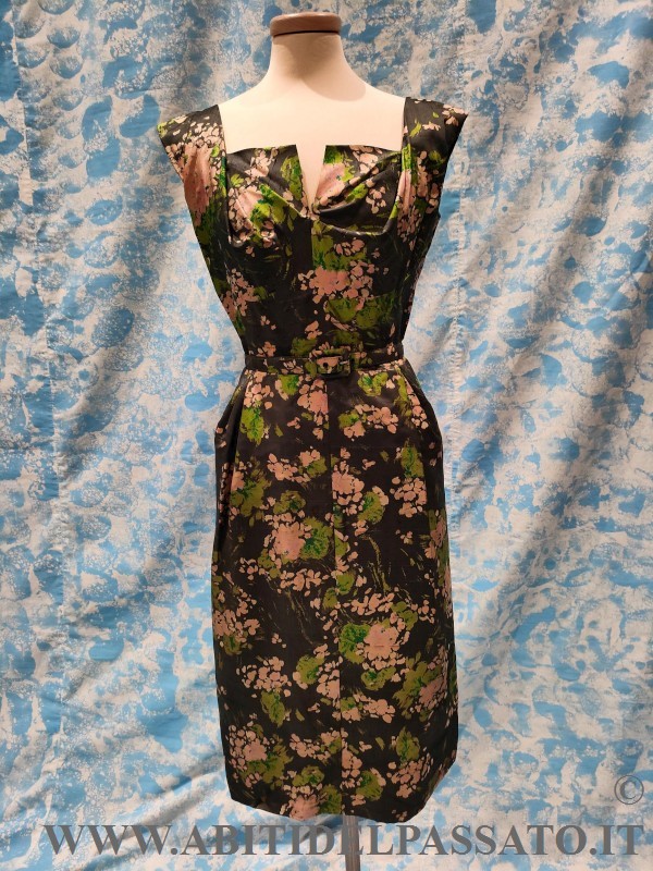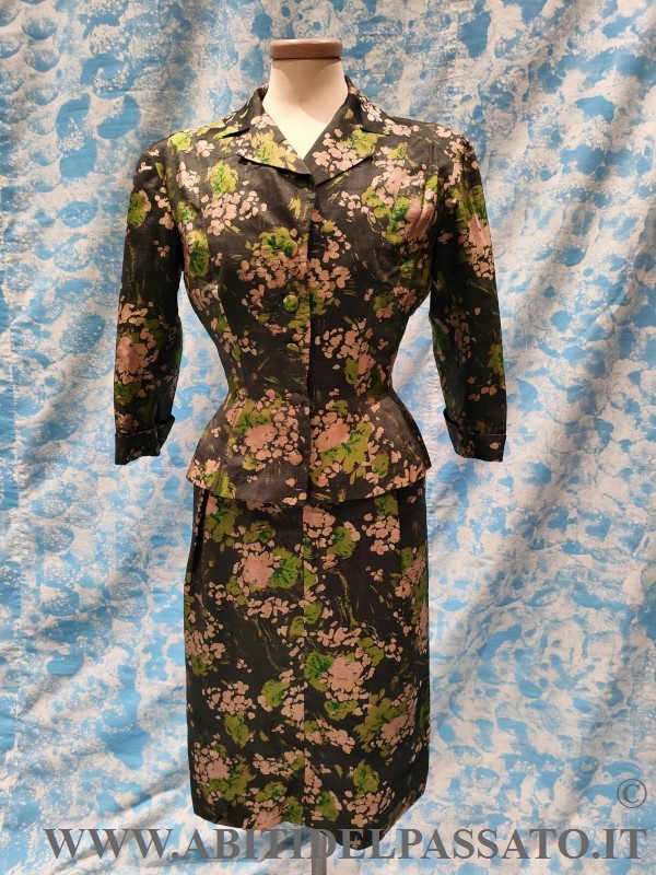 DELIZIOSO COMPLETO DA GIORNO, REALIZZATO IN SCHANTUNG DI SETA, CON STAMPA A FIORI, NEI TONI DEL GRIGIO, ROSA ANTICO E VERDE ACIDO, COMPOSTO DA ABITO INTERO SENA MANICHE, CINTURA E GIACCA CORTA.