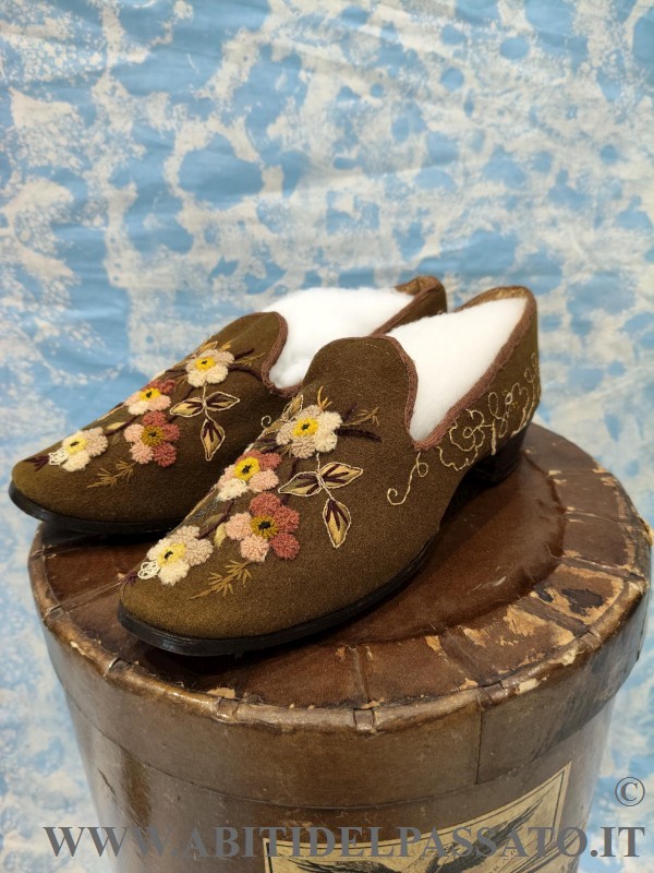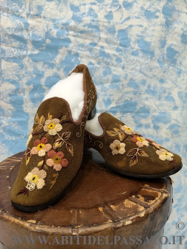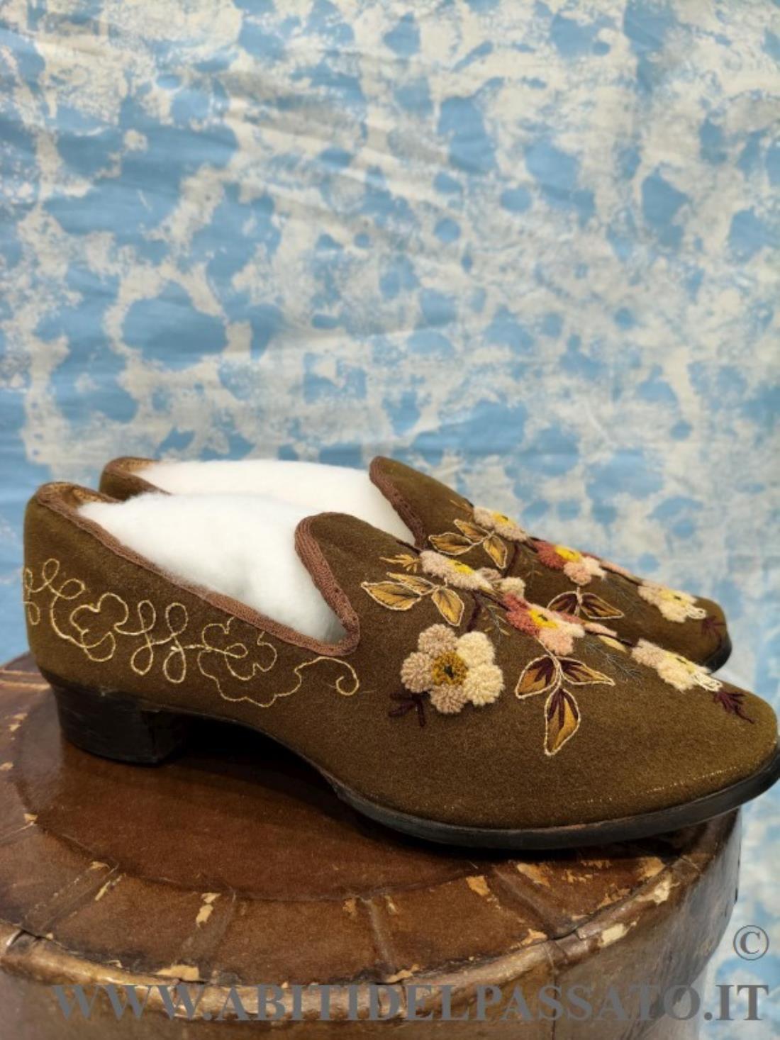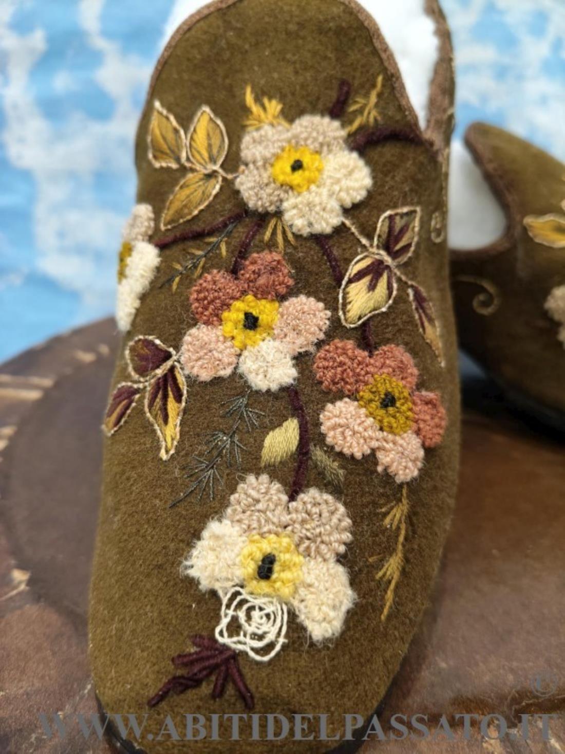 SCARPE FEMMINILI INVERNALI, REALIZZATE IN FELTRO DI LANA COLOR MUSCHIO E TACCO IN LEGNO, RICAMATE IN FILATI DI LANA E SETA, POLICROMI, A MOTIVI FLOREALI CON VARI TIPI DI PUNTO.