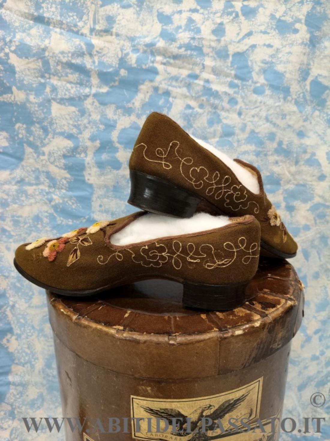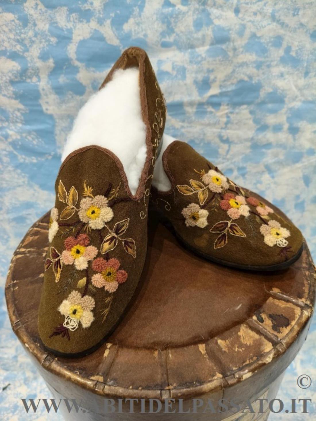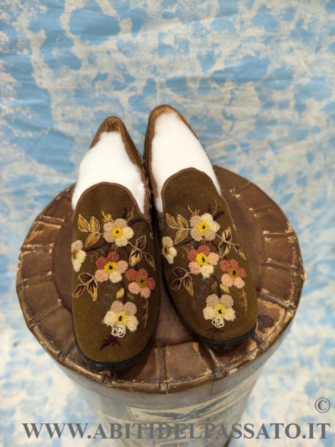 SCARPE FEMMINILI INVERNALI, REALIZZATE IN FELTRO DI LANA COLOR MUSCHIO E TACCO IN LEGNO, RICAMATE IN FILATI DI LANA E SETA, POLICROMI, A MOTIVI FLOREALI CON VARI TIPI DI PUNTO.