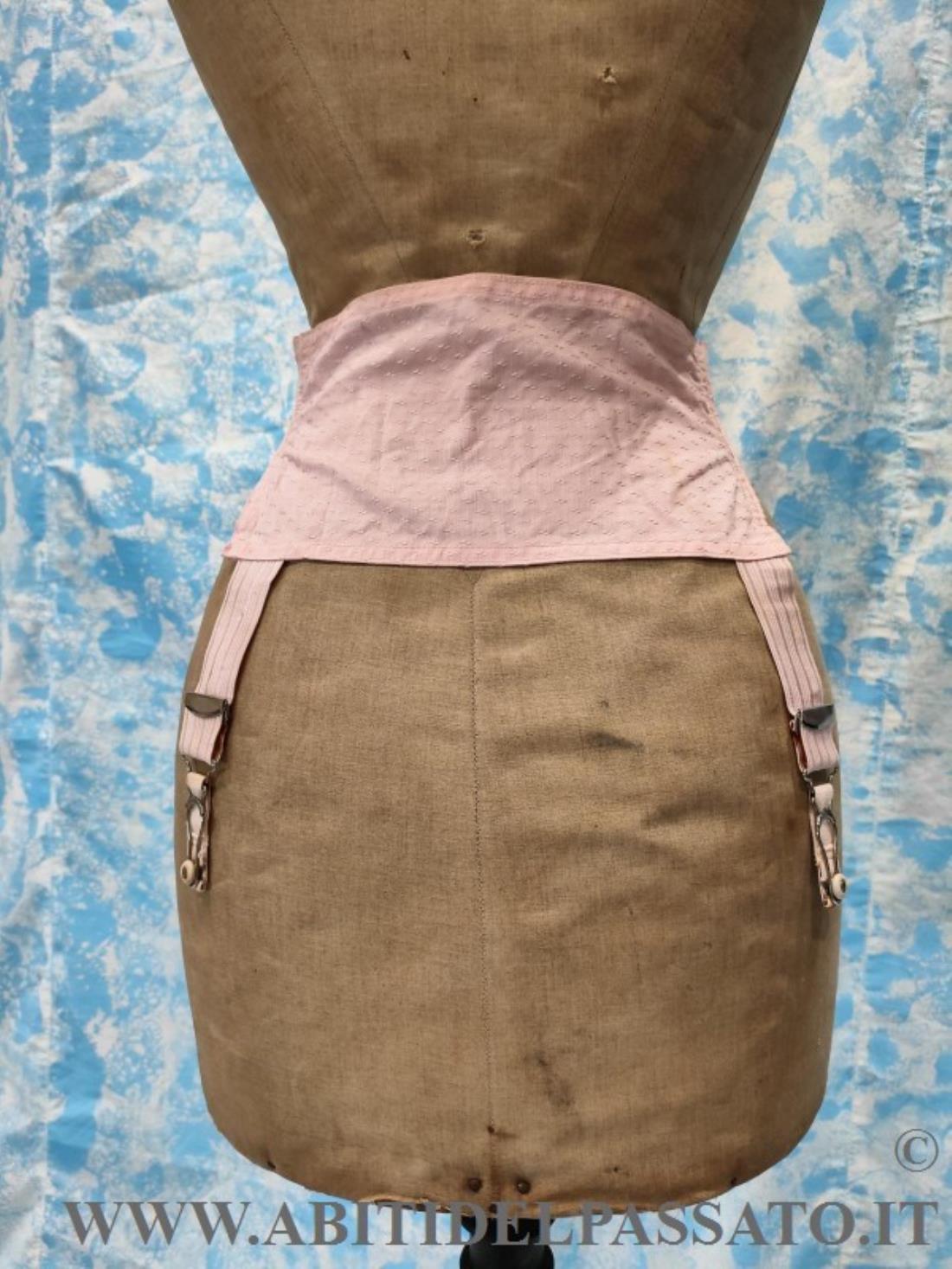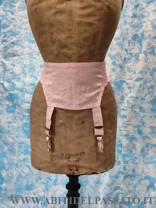 1915-1920, MANIFATTURA IGNOTA,PROVENIENZA FRANCESE, PER QUESTO REGGICALZE REALIZZATO IN TESSUTO OPERATO DA CORSETTERIA, DI COLORE ROSA ANTICO. CHIUSURA LATERALE MEDIANTE 4 GANCI. CONDIZIONI OTTIME.