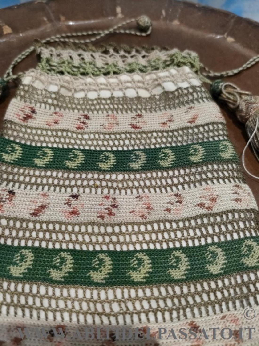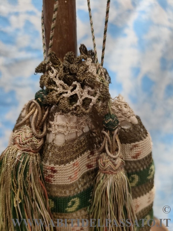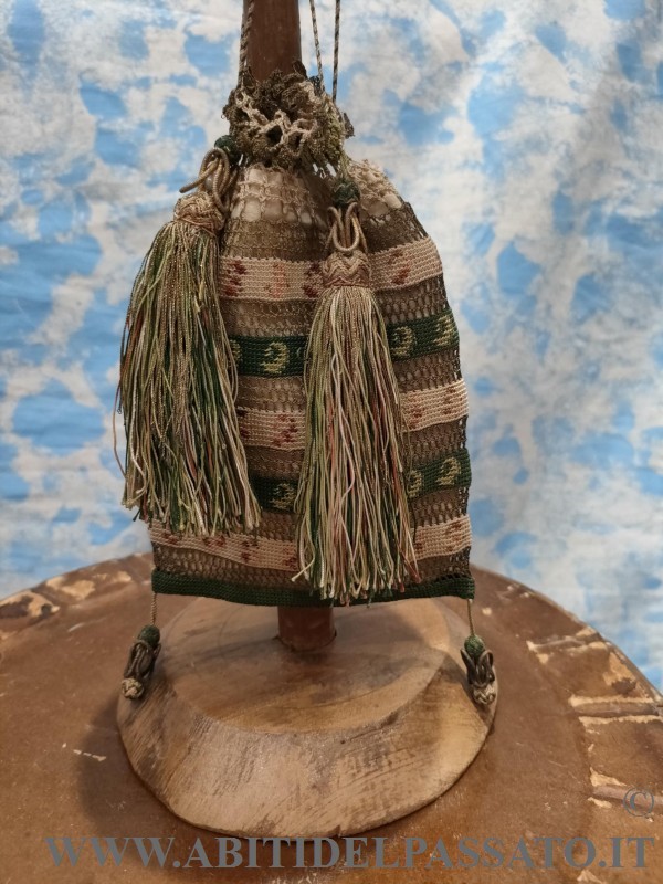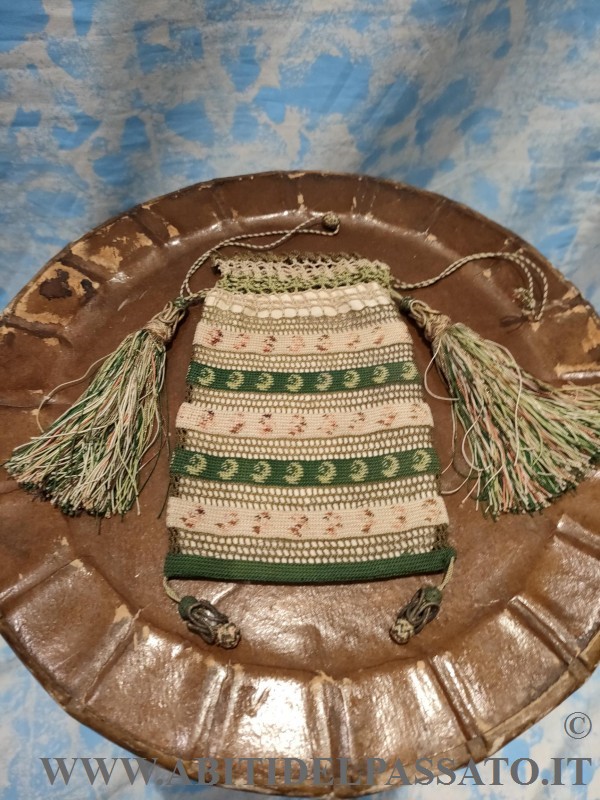 1780-1790: MANIFATTURA FRANCESE, PER QUESTA BORSETTA REALIZZATA A MANO CON FILATO DI SETA POLICROMA A PICCOLO PUNTO, AGO E UNCINETTO. DECORATA DA NAPPE E FRANGE, COMPLETAMENTE REALIZZATE A MANO, SI CHIUDE NELLA PARTE SUPERIORE TRAMITE COULISSE, FODERATA IN TELA DI COTONE.