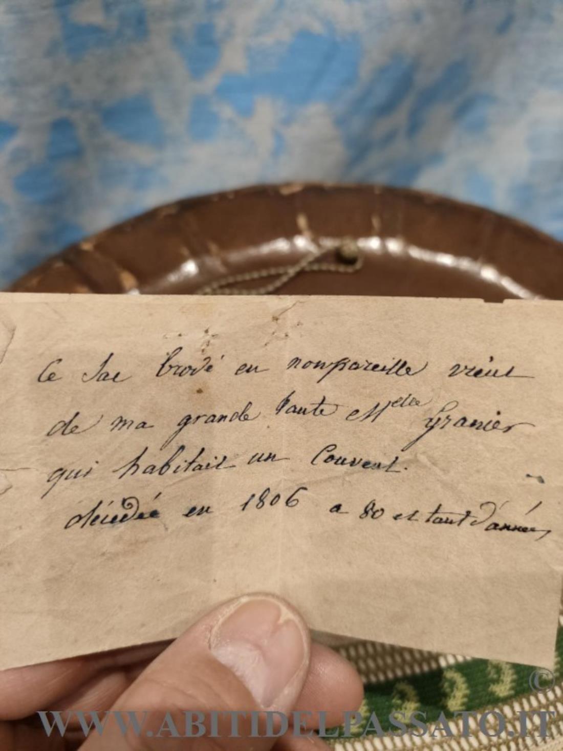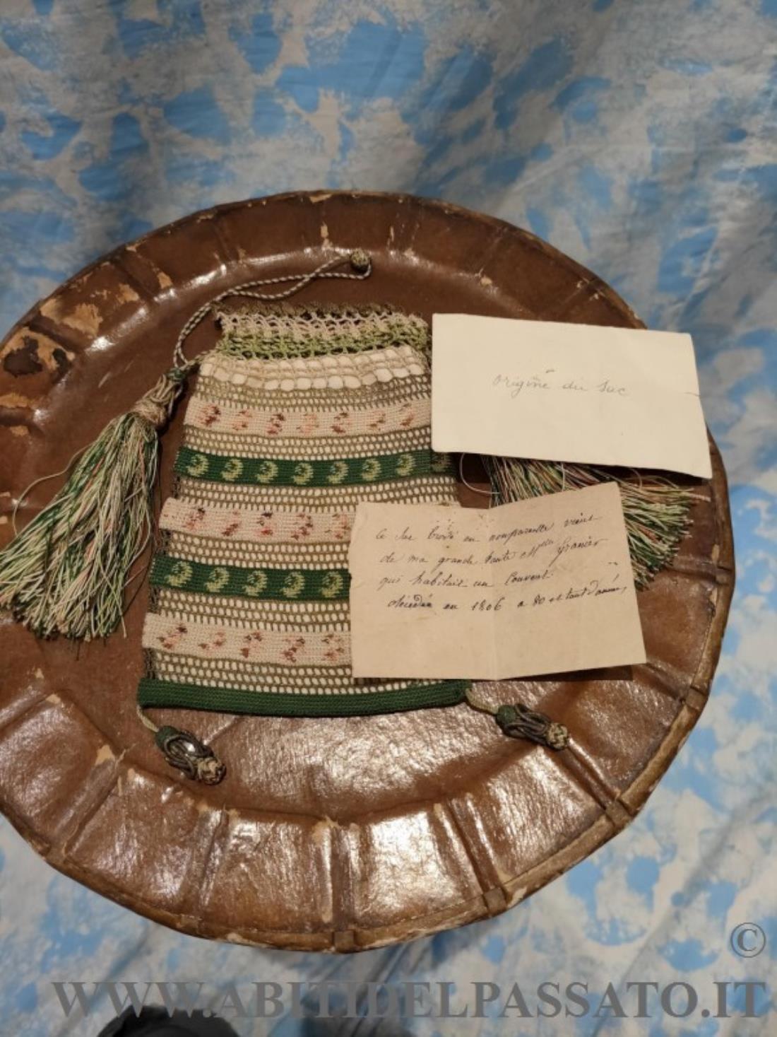 QUESTA BORSETTA RICAMATA CON I FIORELLINI, PROVIENE DA UNA PROZIA, Sig. GRANIER, DECEDUTA A 80 ANNI, NEL 1806.