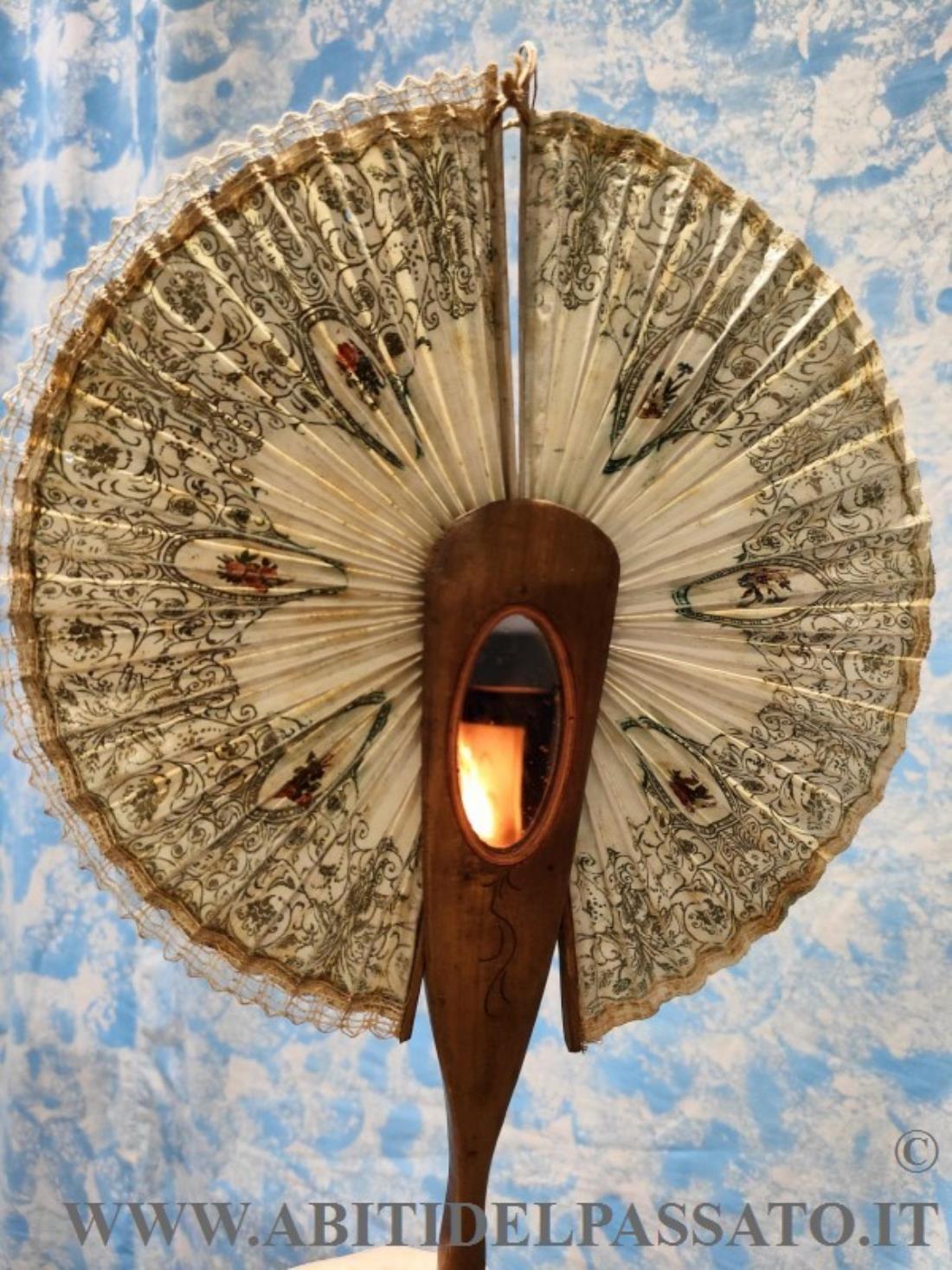 QUESTO TIPO DI OGGETTO SOUVENIR ERA TIPICO TROVARLI SOPRATTUTTO IN COSTIERA AMALFITANA, IL VENTAGLIO SI APRE E SI CHIUDE, TIRANDO UNA CORDICELLA CHE SCORRE ALL'INTERNO DELLA GUARDIA E DOVE SI RITRAE IL VENTAGLIO UNA VOLTA CHIUSO. A VOLTE POTEVANO ESSERE DIPINTI, O DECORATI DA SCRITTE, COME IN QUESTO CASO. NELLA GUARDIA, E' APPLICATO ANCHE UNO SPECCHIETTO OVALE.