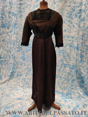 1916: ABITO INTERO REALIZZATO IN SETA A RIGHE MARRONE E NERO, DECORAZIONI IN PASSAMANERIA RICAMATA A MANO CON FILI METALLICI, FIBBIA NEL PUNTO VITA, BOTTONI RICOPERTI IN FILO DI SETA. PRIVO DI APERTURE. L'ABITO IN OGGETTO E' SICURAMENTE UN ...