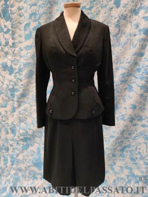 1948: ETICHETTA: "DEGUILLAUME S.AF.BRYK&C. VENEZIA. TAILLEUR DA GIORNO REALIZZATO IN JERSEY DI LANA DI COLORE NERO E PROFILATO IN RASO DI SETA. CAPO DI ALTA SARTORIA.CONDIZIONI ECCELLENTI.