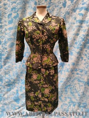 1959: MANIFATTURA ITALIANA PER QUESTO COMPLETO DA GIORNO, REALIZZATO IN TESSUTO DI COTONE E SETA STAMPATA, COMPOSTO DA ABITO INTERNO E GIACCHINO CORTO. APERTURA FRONTALE MEDIANTE BOTTNI RICOPERTI DELLO STESSO TESSUTO.