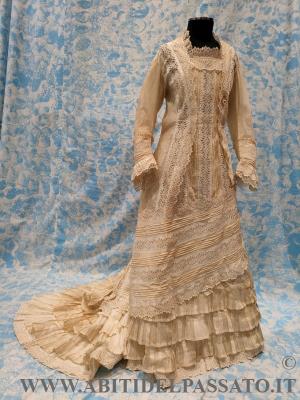 ABITO INTERO, REALIZZATO IN BATISTA DI LINO E TELA DI COTONE, ARRICCHITO DA INTRODOUR E BERTA DI MERLETTO MECCANICO. APERTURA FRONTALE LATERALE PARTENDO DA SOTTO IL PUNTO VITA...