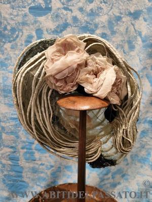 CAPPELLO DA GIORNO, REALIZZATO DA UNA BASE DI FILI METALLICI INTRECCIATI TRA LORO, CRINE, CHIFFON DI SETA E DECORATO DA FIORI E FOGLIE IN SETA.