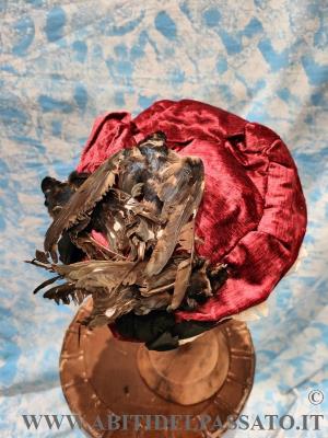 CAPELLO DA GIORNO, REALIZZATO IN VELLUTO DI SETA FIAMMATO, DI COLORE ROSSO VINO, ARRICCHITO DA DUE UCCELLINI INTERI IMBALSAMATI E TRINE...
