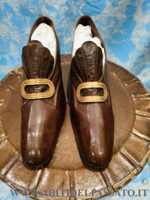 1910-15, MANIFATTURA FRANCESE, ELEGANTE PAIO DI SCARPE FEMMINILI DA GIORNO, REALIZZATE IN PELLE DI CAPRETTO DI COLORE MARRONE, DECORATE DA GRANDE FIBBIA IN METALLO DORATO.