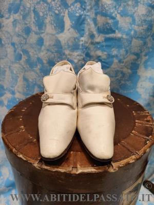 1915-18, MANIFATTURA FRANCESE, ELEGANTE PAIO DI SCARPE FEMMINILI DA GIORNO O SPOSA, REALIZZATE IN PELLE DI CAPRETTO DI COLORE AVORIO, DECORATE BOTTONE GIOIELLO.