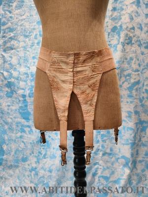 1900-1910, MANIFATTURA IGNOTA, PROVENIENZA FRANCIA, PER QUESTO REGGICALZE REALIZZATO IN SETA OPERATA IN COLOR SALMONE, APERTO FRONTALMENTE MEDIANTE 5 GANCI. CONDIZIONI OTTIME.