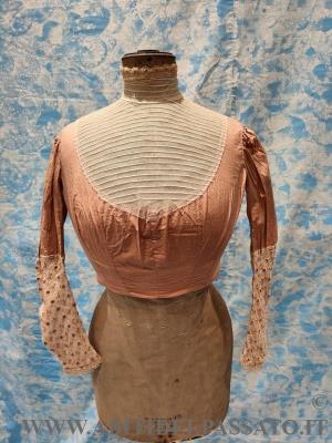 1910-1915: MANIFATTURA ITALIANA, ROMA, PER QUEST FINTA CAMICIA REALIZZATA IN TELA DI COTONE DI COLORE ROSA ANTICO E TULLE DI COLORE AVORIO. CHIUSURA POSTERIORE MEDIANTE GANCI, GUIMPE RINFORZATA DA SERPENTINE METALLICHE, MANICHE IN TULLE DI ...