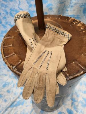 1910-15: MANIFATTURA ITALIANA, GUANTI DA GIORNO REALIZZATI IN CAPRETTO DI COLORE BEIGE. RICAMATI SUL DORSO IN FILATO DI SETA, DA DOPPIO GIRO DI PUNTO CATENELLA E DECORATI CON LAVORAZIONE AD INTAGLIO DA PASSAMENERIA