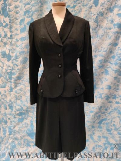 1948-1950 CIRCA, MANIFATTURA ITALIANA, PROVENIENZA, CITTA' DI VENEZIA. TAILLEUR REALIZZATO IN TESSUTO DI LANA E SETA DI COLORE NERO. GIACCA DALLA COSTRUZIONE CLASSICA, SARTORIALE, INTELATA, CON COLLO A SCIALLE E CHIUSA FRONTALMENTE MED...