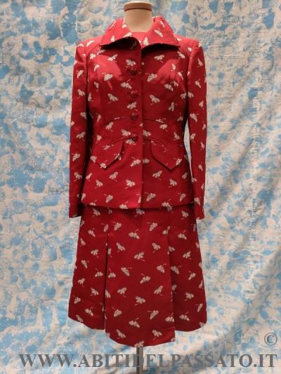 1965-1968, MANIFATTURA ITALIANA, ETICHETTA: MODA STYLBERT COMPLETO REALIZZATO IN TESSUTO MATELASSE' MISTO SETA, LA BASE DI COLORE ROSSO VIVO, CON MOTIVI FLOREALI NEI TONI DELL'AZZURRO E AVORIO, COMPOSTO DA ABITO INTERO SENZA MANI...