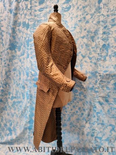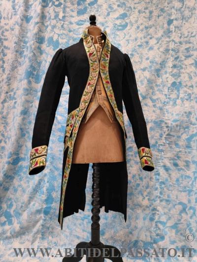 1780 CIRCA, MANIFATTURA IGNOTA, PROVENIENZA ITALIA MERIDIONALE, NAPOLI. MARSINA REALIZZATA IN VELLUTO DI SETA OPERATO NEI TONI DEL COLOR MARRONE SCURO E AZZURRO, COMPLETA DI GILET E PANTALONI. RICAMI REALIZZATI IN FILATI SI DETA P...