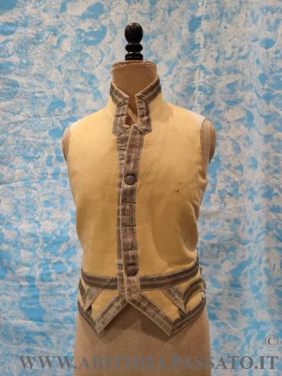 1800 CIRCA, MANIFATTURA ITALIANA, PROVENIENZA CITTA' DI BOLOGNA. GILET DA SERVIZIO, REALIZZATO IN PANNO DI LANA COLOR BURRO, GALLONI METALLICCI, BOTTONI RICAMATI, FODERA GREZZA DI LINO. PROVENIENTE DA IMPORTANTE FAMIGLIA BOLOGNESE...